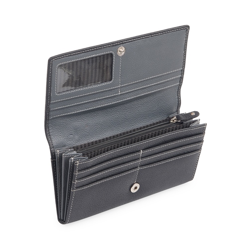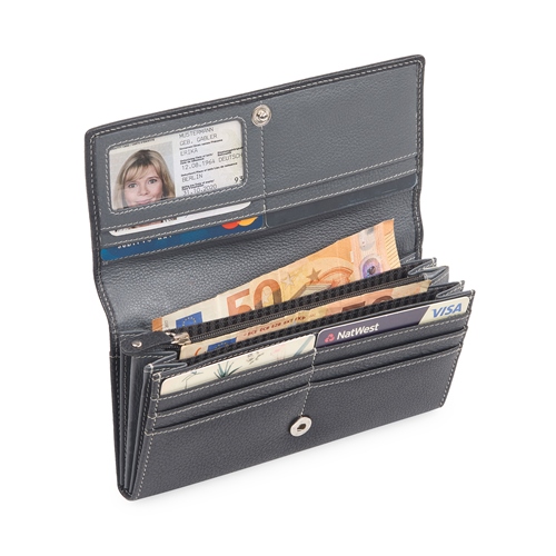• 4 CURRENCY SLOTS. • 1 ZIPPER COIN POCKET. • 2 SECRET POCKET. • 9 CARD SLOTS. • 1 TRANSPARENT ID WINDOW.