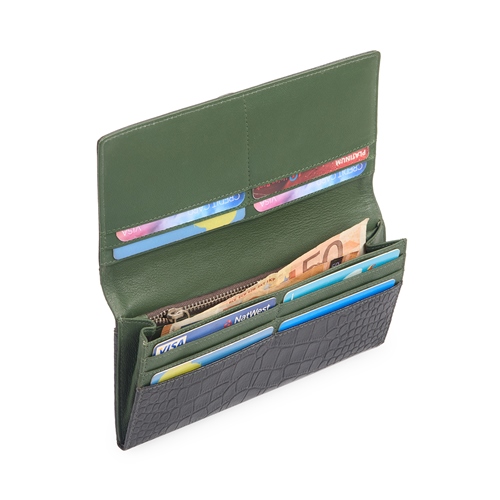 1 PROVISION TO HOLD MOBILE. •ZIPPER COIN POCKET. •2 CURRENCY SLOTS. •1 CARD SLOTS. •