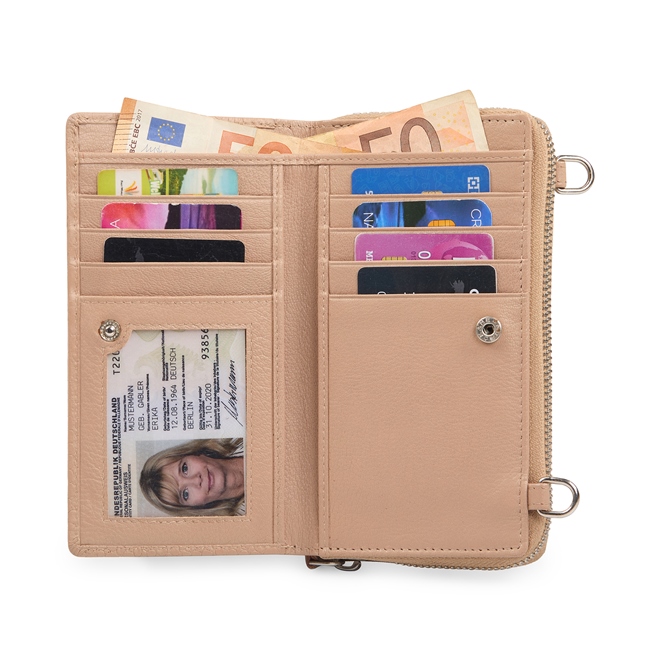 • 1 PROVISION TO HOLD MOBILE. •1 CURRENCY SLOT. •2 SECRET POCKET. •7 CARD SLOT. •1 TRANSPARENT ID WINDOW.