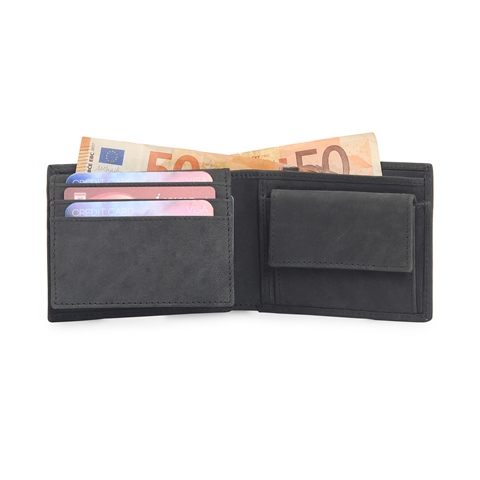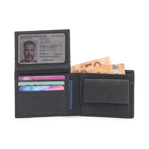 • 2 CURRENCY SLOTS. • 1 COIN POCKET. • 3 SECRET POCKET. • 6 CARD SLOTS. • 1 TRANSPARENT ID WINDOW.